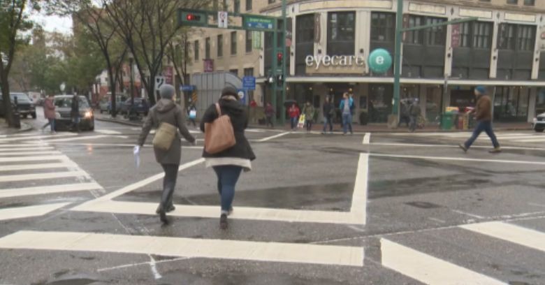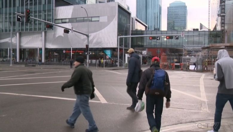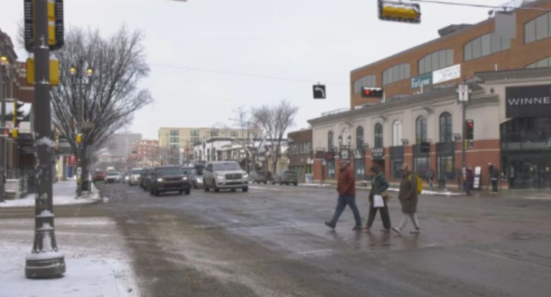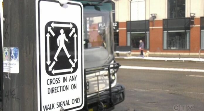行人於 2026 年 3 月 30 日在 Whyte Avenue 與 105 街交界使用行人過路 設施 (CTV News)