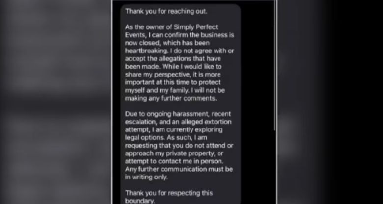Tobin 表示,其公司 Simply Perfect Events 已經結業。