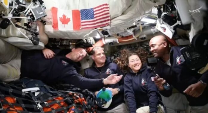 在NASA提供的影片截圖中,Artemis II太空人(左起)Reid Wiseman、Jeremy Hansen、Christina Koch及Victor Glover,於2026年4月4日(星期六)前往月球途中接受訪問時合影。(NASA/美聯社)