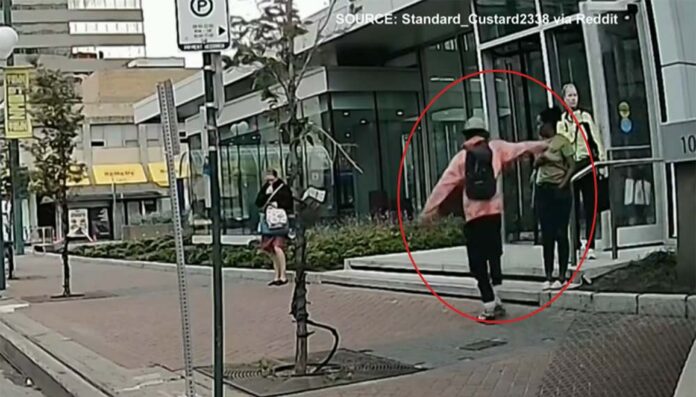 根據警方的新聞稿,8 月 21 日網上流傳一段影片,顯示一名男子在 10303 – Jasper Ave 從一名女子手中搶走手機。