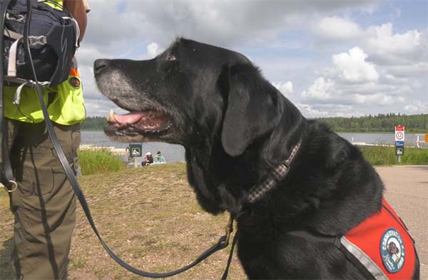 在愛民頓以西約 40 分鐘車程的 Wabamun Lake Provincial Park (華巴門湖),嗅探犬 Hilo 有一個忙碌的星期六。