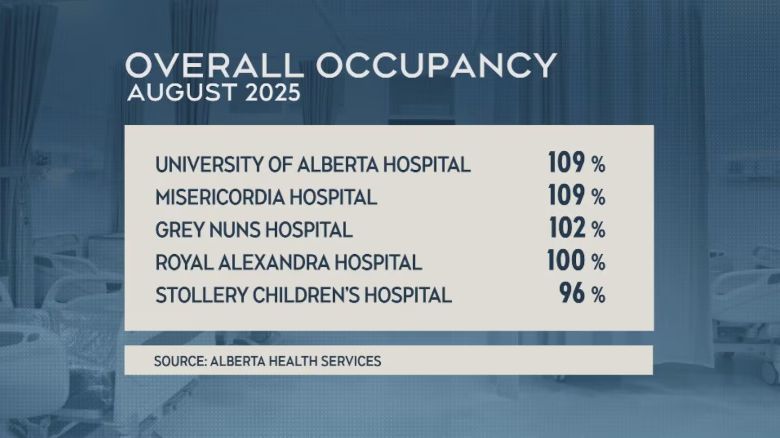 據亞省衛生廳提供的 2025 年 8 月數據,愛民頓四間主要醫院(Grey Nuns, Misericordia, Royal Alex 及 U of A)合共 2,325 張病床中,有 539 張被列為 ALC 類別。