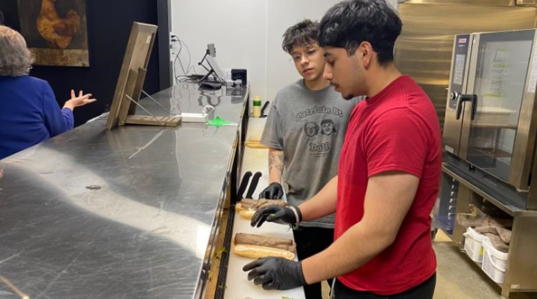 2026年3月25日,兩名青年在 Patricia Street Deli 製作三文治。