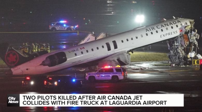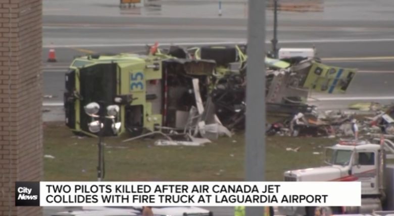 加拿大快運航空一架客機昨晚在紐約拉瓜迪亞機場降落時,與一輛消防車相撞,客機正副機師死亡,另有41人受傷。