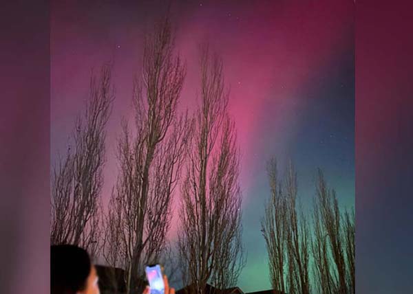 這場由太陽風暴引發的極光盛宴,在日落後不久就開始出現,許多市民拿起手機與相機,紛紛拍下這難得一見的奇景。