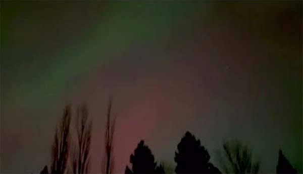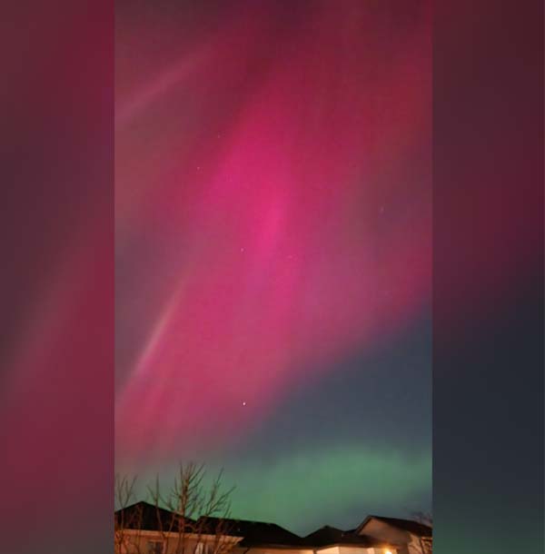 星期二(11日)晚間,愛民頓上空出現罕見的粉紅極光,為冬夜增添一抹夢幻色彩。