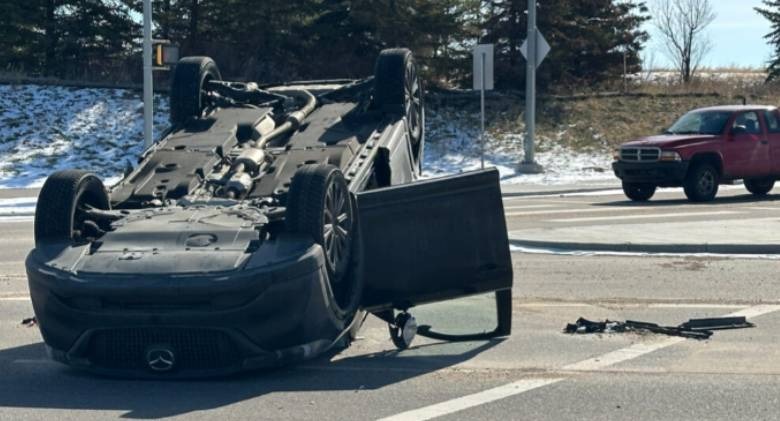CityNews 在上午 10 點前抵達現場。可見一輛受損的白色 SUV 停在路口中央,旁邊路面上有一個兒童安全座椅;數公尺外則是一輛翻覆的汽車。