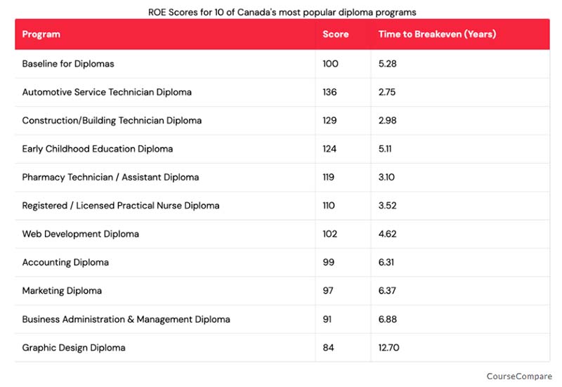 在文憑課程中,投資回報率最高的是汽車維修技術員課程,得分為 136。根據報告,修畢此文憑的畢業生只需 2.75 年即可回本。