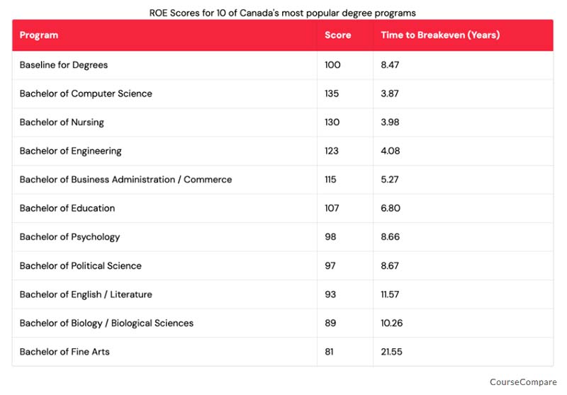 在加拿大大學學位中,投資回報率最高的是(Bachelor of Computer Science),得分為 135。報告指出,修畢此學位的畢業生只需 3.87 年即可回本。