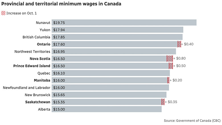 沙省本月與消費者物價指數掛鉤的最低工資上漲至 15.35 元,亞省的最低工資隨之成為全國最低。